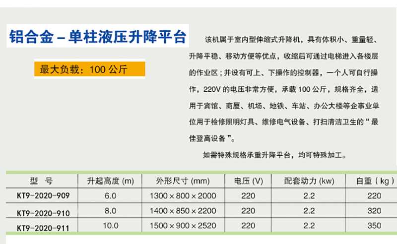 KENTA/克恩达 KT9-2020-909 F42906 铝合金单柱液压升降平台