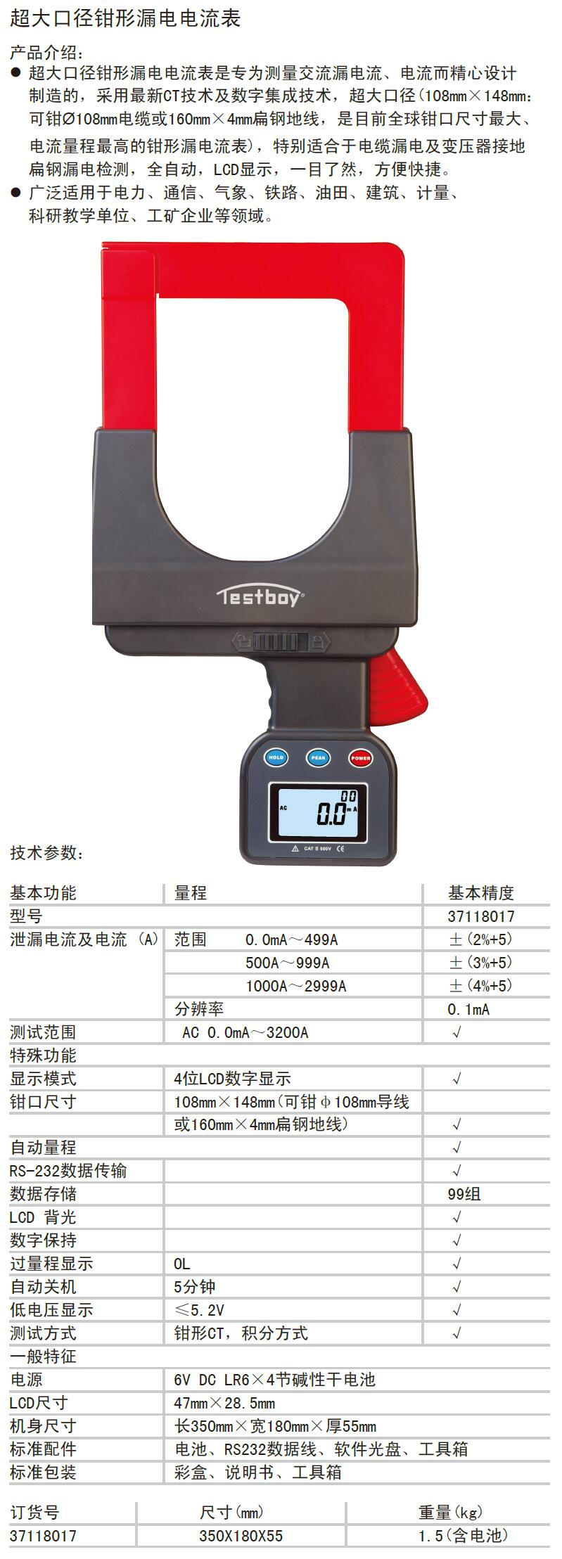 TESTBOY/特博特 37118017 AF059929 超大口径钳漏电电流表