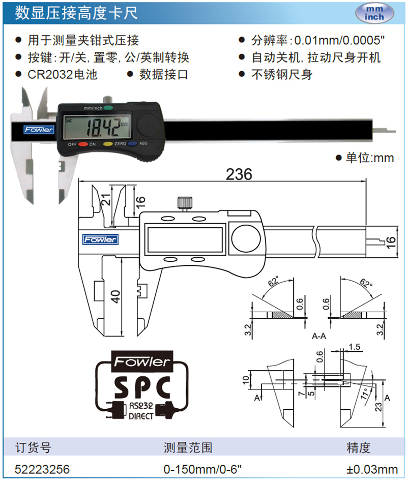 52223256 FOWLER/福勒 52223256 AF051227 FOWLER 数显压接高度卡尺 52223256 0-150mm 0-6" 产品主图覆盖