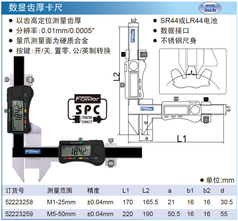 52223258 FOWLER/福勒 52223258 AF051239 FOWLER 数显齿厚卡尺 52223258 M1-25mm 产品主图覆盖